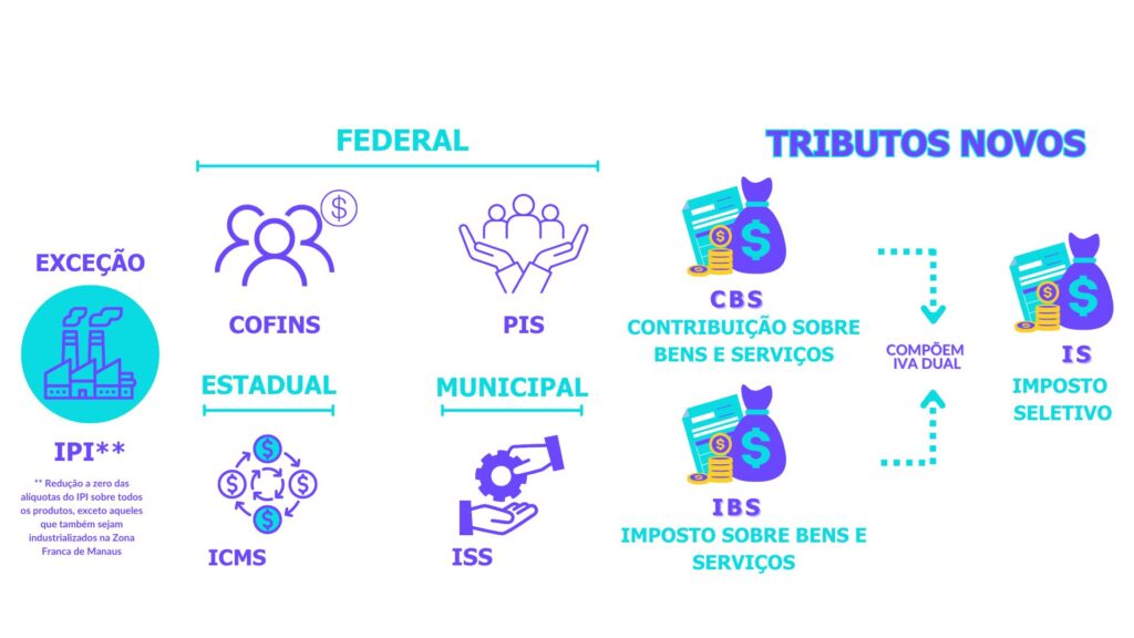 Em âmbito federal, a CBS substitui o PIS e a COFINS. Já em âmbito regional, o IBS substitui tanto o ICMS (atualmente competência dos estados) quanto o ISS (competência dos municípios). A instituição desses novos tributos, bem como a criação do Comitê Gestor, foi regulamentada pela Lei Complementar nº 214/2025, aprovada em janeiro de 2025. Para se aprofundar sobre o processo de regulamentação da reforma, desde as PECs até sua aprovação, clique aqui! Além dos impostos que compõem o IVA Dual, a Lei Complementar nº 214/2025 também instituiu o Imposto Seletivo (IS). Este imposto tem por finalidade desestimular o consumo de produtos e serviços prejudiciais à saúde e ao meio ambiente, conhecido popularmente como o Imposto do Pecado. Quanto ao Imposto sobre Produtos Industrializados (IPI), inicialmente previa-se sua extinção em 2027. No entanto, o IPI continuará vigorando para manter a competitividade das indústrias localizadas na Zona Franca de Manaus (ZFM). Esse tema será abordado mais detalhadamente abaixo, não deixe de conferir! Dessa forma, no que diz respeito aos tributos sobre o consumo, a reforma tributária traz a seguinte sistemática: Essas mudanças impactarão toda a estrutura de cálculo, escrituração, apuração, pagamento, concessão de créditos e tratamento diferenciados,  gerando importantes desafios para a sociedade como um todo.